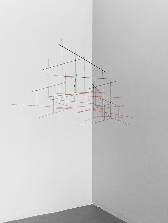 Usually only fixed at one point, the hanging sculptures by Knopp Ferro are in constant motion. Sometimes narrow, sometimes expansive, they invariably remain delicate and fragile, floating above the viewer. Reacting to their surroundings, they change in gentle movements, thereby also changing the viewer's perception.